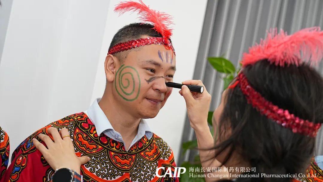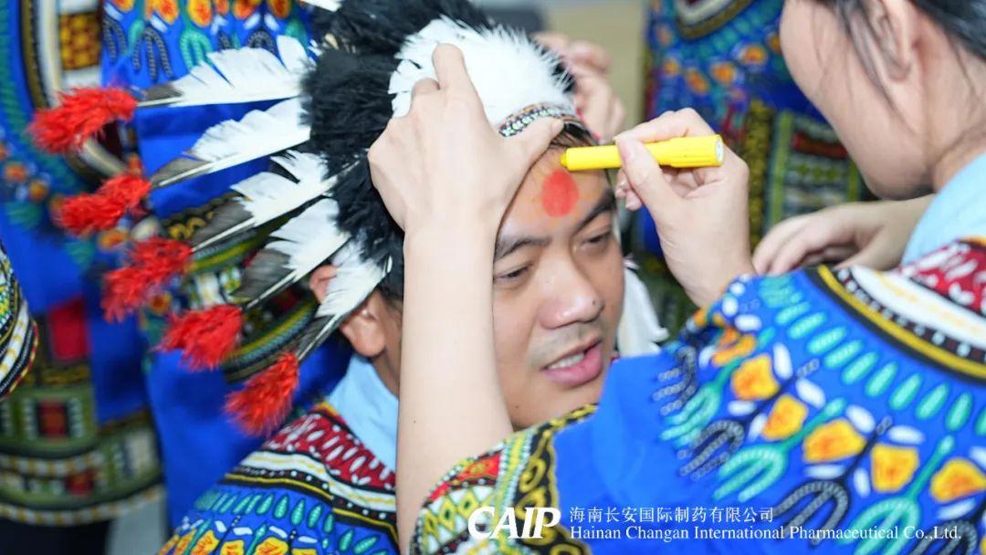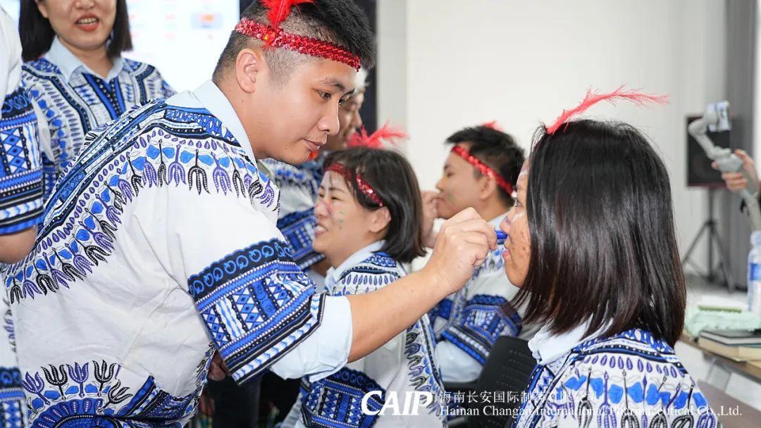 緊接著,全體骨干分為四個部落,選舉酋長、王妃和舞姬,開啟族內(nèi)建設(shè),取族名、立口號、擺隊(duì)形,并換上非洲當(dāng)?shù)氐难b扮——頭戴羽冠、特色服飾,用特殊的油彩繪制出專屬部落五彩斑斕的精致臉譜。